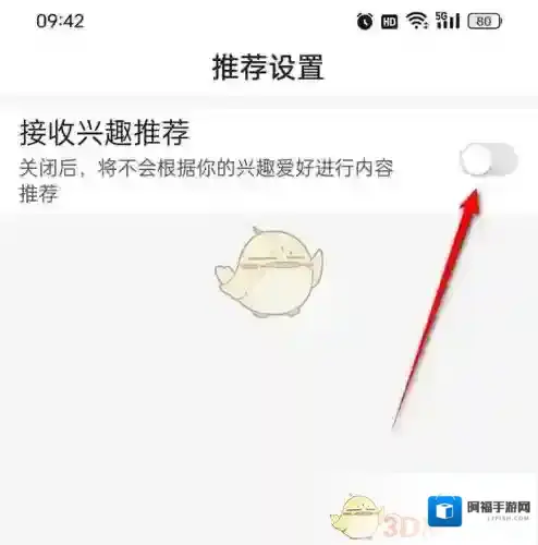 3、将“接收兴趣推荐”旁的小滑块点亮即可开启,此时点击小滑块。
