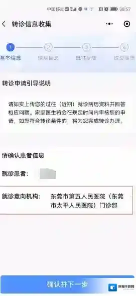用户可通过打开“健康东莞”小程序,点击首页“转诊申请”,选择意向转诊机构并上传既往病历资料(如检验报告),填写健康信息后提交申请。系统一般24小时内完成审核,审核通过后凭电子转诊单到指定医院就诊,未通过则需到社区卫生服务中心现场处理。