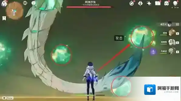 挑战风蚀沙虫,待它释放风蚀弹时,用水、火、雷、冰任意一种元素攻击风蚀弹。