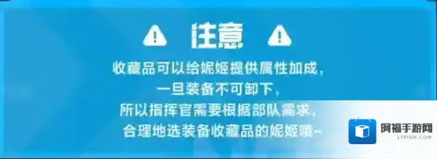 收藏品一旦装备不可卸下,指挥官需根据部队需求合理选择装备收藏品的角色,充分发挥其属性加成优势。