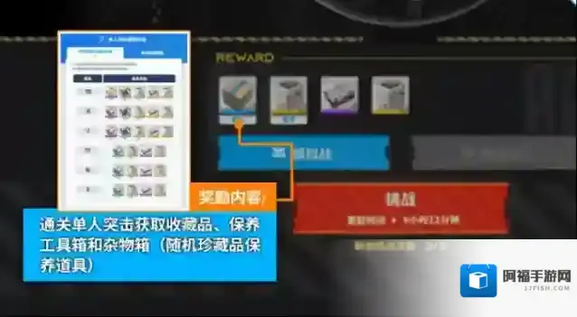 通关单人突击模式,可获取收藏品、保养工具箱和杂货箱(含随机珍藏品保养道具)。