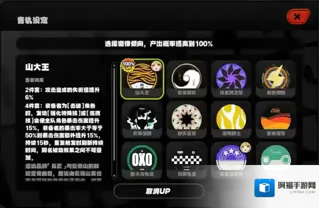 首选新出的山大王套,2件套能提供6%失衡值,4件套给全队提升30%爆伤,剩下的两个格子可以带2冲击,如果攻击没有达到3400或者暴击没有达到50的话可以带2攻击或者2暴击