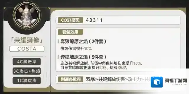 声骸方面选择新火套-奔狼燎原之焰,2件套可以提升10%的热熔伤害,5件套在我们施放大招后,可以为队伍提供15%的热熔伤害加成以及自身的20%大招伤害加成,持续35秒