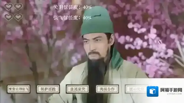 获取关羽张飞信任度,选项:自述家世,保护百姓,赞赏关羽张飞