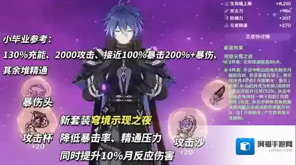 常驻5星「和璞鸢」和挪德卡莱锻造「掘金之锹」。圣遗物可刷「穹境示现之夜」,主词条“攻、攻、暴伤”,副词条“暴击、暴伤、充能、精通”。优先确保130%充能、2000攻击、接近100%暴击200%暴伤,再考虑精通。注意套装有30%暴击率,避免暴击溢出。