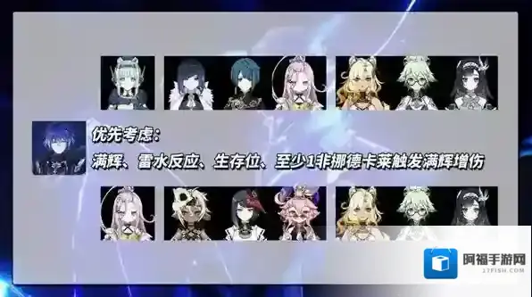 需满足:雷队友降充能、水队友触月感电、双挪德卡莱角色凑满辉、非挪德卡莱角色触发增幅、生存位。