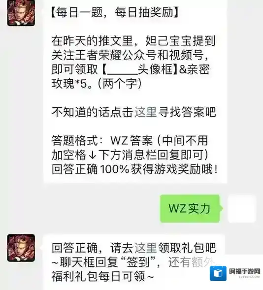 问题:在昨天的推文里,妲己宝宝提到关注王者荣耀公众号和视频号,即可领取_____头像框 亲密玫瑰*5(两个字)。