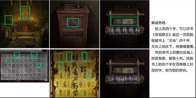 30、点击左边的柜子,根据锁上的文字、《告祖祭文》以及百寿图的提示,解开柜子的锁。