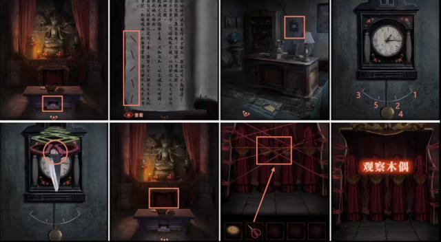 47、根据暗格里的书上的红线斜率,按顺序摆动钟摆(剪刀刺客),拿到剪刀。用剪刀剪开红绳,完成观察木偶。