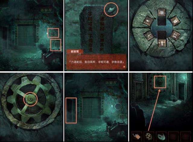 49、崔婉莺:点击石碑拿到鱼形物件,根据石碑上的提示,墙上的六道机关要将六个字块调整到都能亮着的位置,解开机关拿到轮状零件,往左走,用轮状零件启动装置。