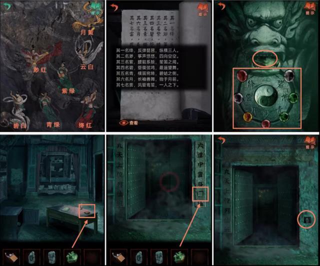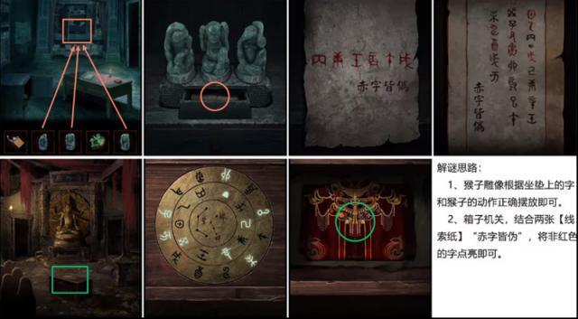 55、崔婉莺:拿到猴子雕像并阅读《六转妙法录》。张辰瑞:根据《六转妙法录》,调整好墙上的仙女位置,根据仙女的姿态,解开柜子机关,拿到线索纸。