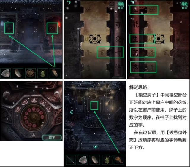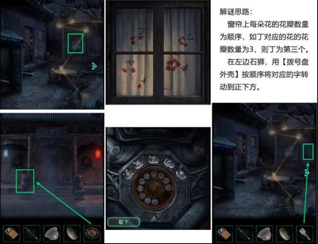 28、在大门的左右两个窗户处使用镂空牌子,获得线索提示,将拨号盘外壳装到右边石狮上,解开机关拿到钥匙,用钥匙打开门锁。