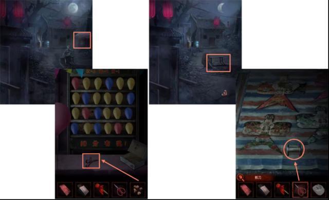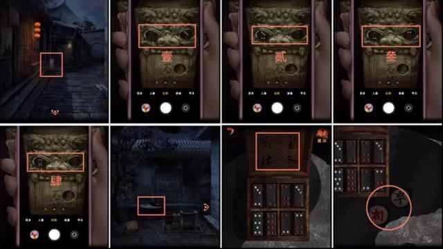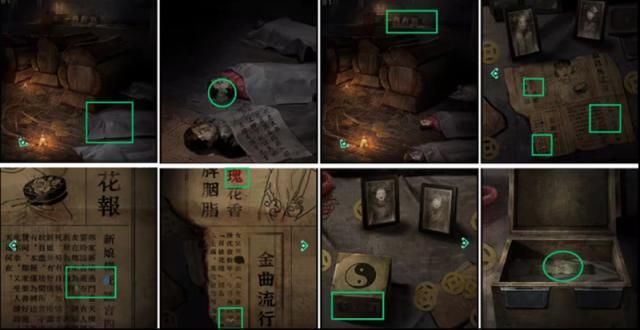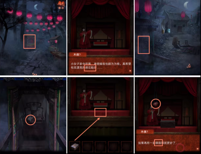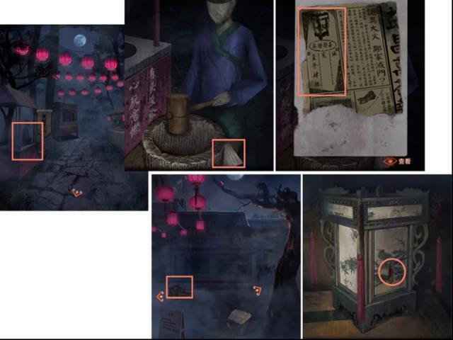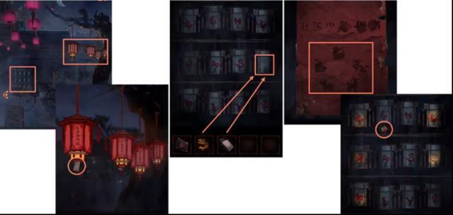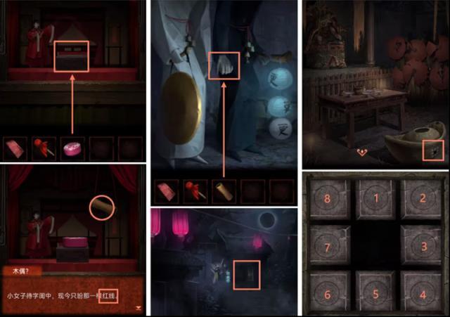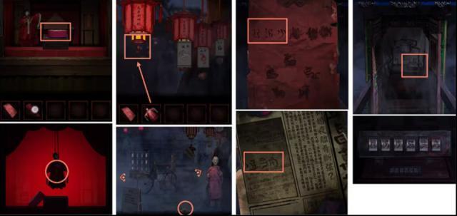 21、切换到二更场景,将红绳放到木偶戏台上,点击拿到新娘木偶,将新娘木偶挂到对应谜语的灯笼下,地上拿到旧时代报纸。根据请柬和旧时代报纸的图案提示,解开花轿里的密码盒(镜中纸人高能)。