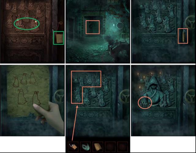 52、张辰瑞:墙上拿到一对耳环,右边有本黄皮书,点击阅读。崔婉莺:进入打开的门,右边点击拿到线索纸,根据线索纸和张辰瑞那边的浮雕,找到对应的字,用打火机点燃对应的灯芯(浮雕小高能),拿到鱼形物件。
