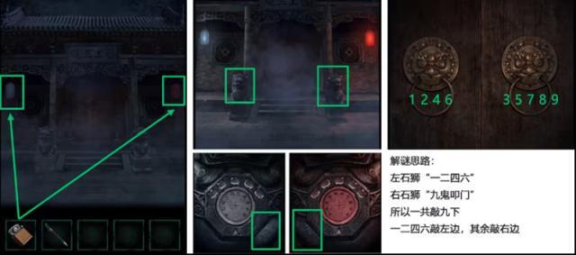 26、点击窗户(纸人高能),根据窗帘上的提示,将拨号盘外壳装到左边的石狮上,解开机关拿到钥匙,取下拨号盘外壳,用钥匙打开门锁。