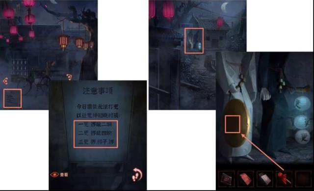 13、点击地上的告示牌,转到背面,根据注意事项的提示,用锣棒敲击白无常手里的锣两次,切换到一更场景。