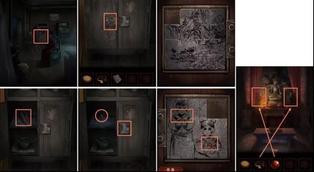 46、将小方块放在柜子的左边拼图机关上,完成拼图打开柜子,点击绣花鞋后拿到宝珠。根据右边拼图机关的图,将环状饰品和宝珠放在男童和女童纸人上,打开暗格。