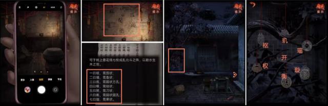 41、对着墙拿出手机(砸机高能),墙上出现字,根据墙上的字和《太一宝鉴》的提示,调整树上的花钱,拿到发条。