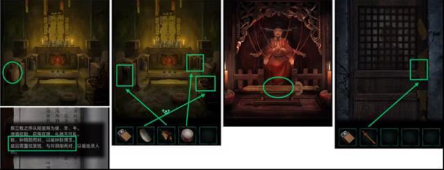 18、切换到二更场景,将胭脂盒放到木偶戏台上,拿到梆子,获得需要红线的提示。将梆子放到黑无常手里,用锣棒依次敲击锣、梆子、锣,切换到三更场景(无常贴脸高能)。点击进庙,点击元宝上的机关,解开机关拿到一串铜钱。