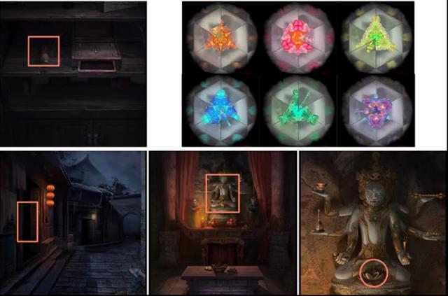 45、点击柜子上的万花筒,(万花筒高能)切换可以看到六个物件。进入打开门的房间,点击藏尊,根据万花筒中各个物件的方位,调整好物件的位置,拿到环状饰品和小方块。