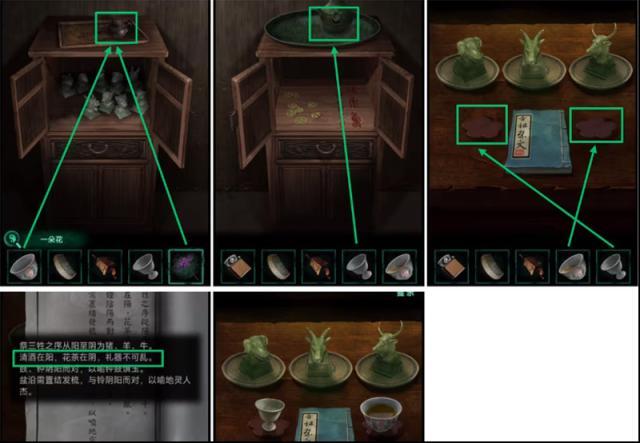34、将一朵花放在左边柜子的茶壶里,用空茶杯盛茶,拿到一杯茶,用空酒杯在右边柜子上盛酒,拿到一杯酒。根据《告祖祭文》的提示,将一杯茶一杯酒放在对应的位置。