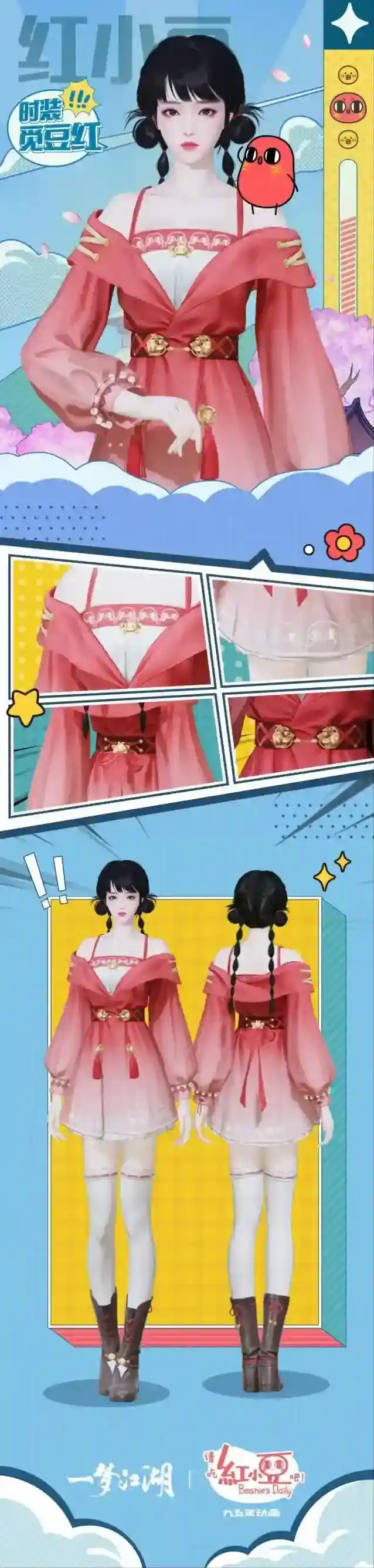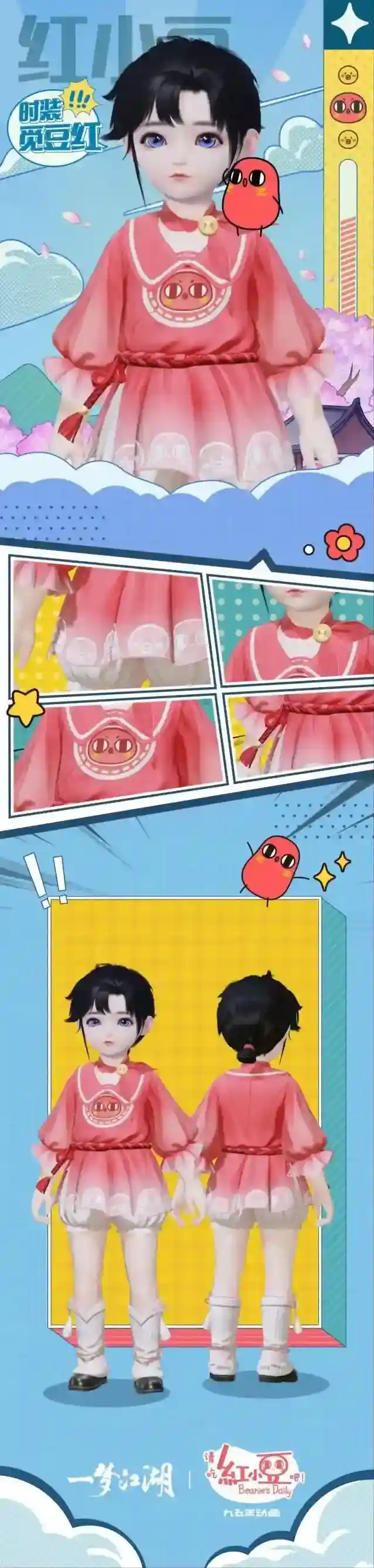 但是红小豆这么可爱,怎么能吃红小豆!云锦楼小师傅遇见了它,喜欢得不得了,当即以它为原型做了一套新衣,成为少侠们最新的时尚穿搭~