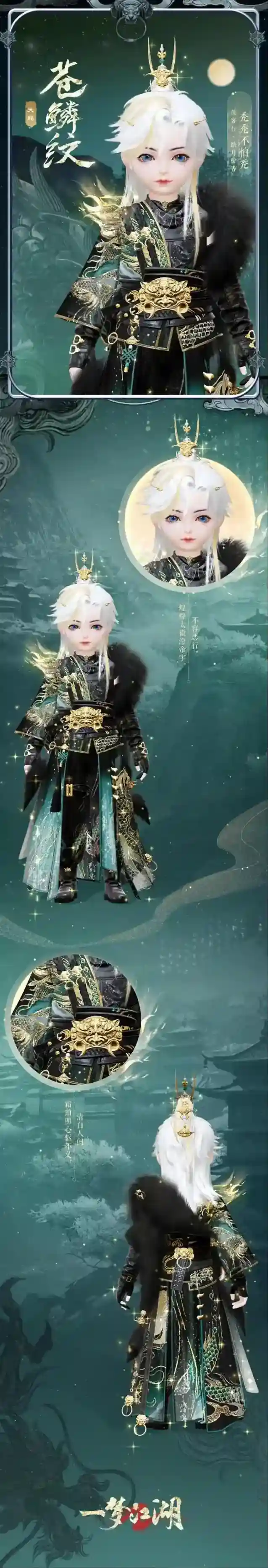 银白的飞琼点雪取自深海冰销,兼合雷电溢彩。正是鳞裳逐电曜,云盖随风回。穿戴于身,隐有凌宇震乾威之清肃意感。鎏金异色的暮境芜痕则如塞外边城的落日余晖之下,倏忽流电映染霞云,疏阔旷远,华贵中又显厚重古意。