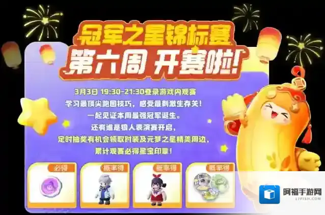 击败了怪兽,星妹还有惊喜宣布!冠军之星锦标赛第六周(3月3日)就要开赛啦3月3日19:30-21:30登录游戏内观赛见证冠军诞生!参与定时抽奖还有机会领取时装及元梦之星周边获得星宝印章哦~