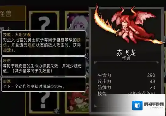 定位分析:单体输出手,测试过发现只给进入她所在房间战斗的勇者加烧伤,路过都不加。