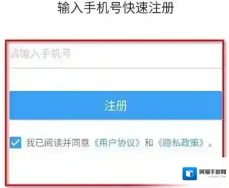 4、输入手机号、阅读并勾选协议,之后点击注册。