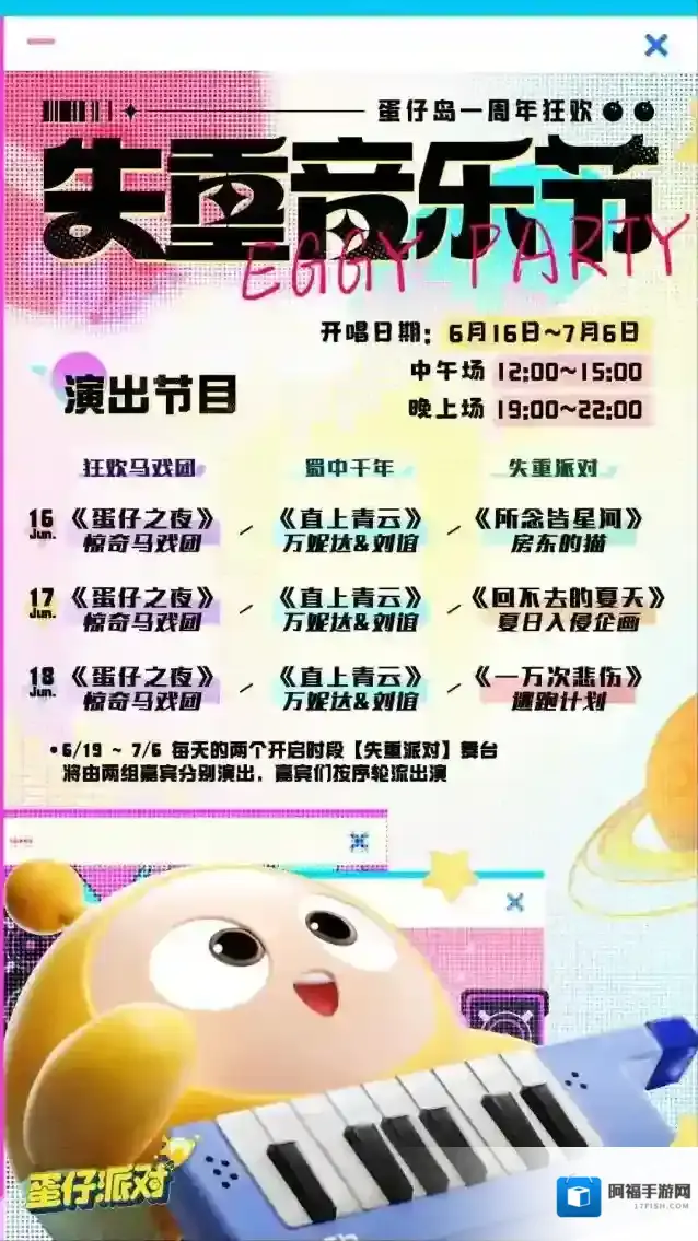 节目单音乐律动不停,快乐无边无尽。欢乐世界休闲竞技手游《蛋仔派对》周年庆典失重音乐节炸裂来袭,等你一同加入失重狂欢,为这场视听盛宴增添更多精彩!关于《蛋仔派对》音乐启动,快乐失重!6月16日,欢乐世界休闲竞技手游《蛋仔派对》迎来一周年版本!十大免费福利、周年庆大事件“失重音乐节”、《中国奇谭》 蜜雪冰城重磅联动、庄园系统……加入失重狂欢,一同翻开周年庆全新故事篇章!