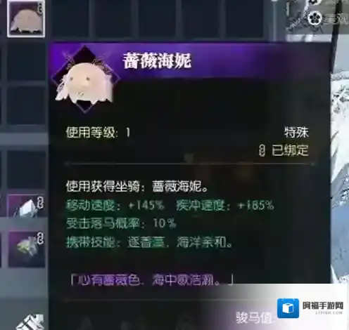 4、这款坐骑拥有特殊技能逐香藻和海洋亲和,其移动速度高达145%。