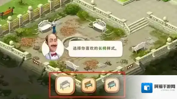4、如图,提供了三种长椅可以选择,点击相应的长椅可以进行预览,选择好后点击右下角打勾图标即可确认,得到了管家的好评。