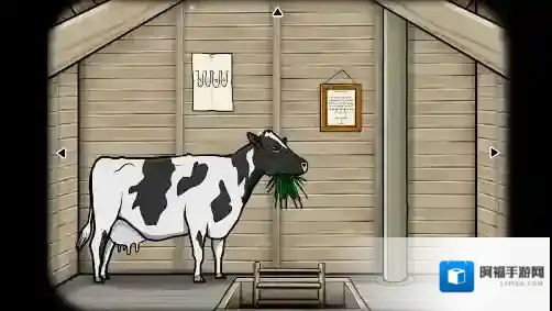 11、阁楼—奶牛视角:将(草)塞到奶牛的嘴里,点击几次让它吃下去(不然挤不出奶);将(锅)放到奶牛的肚子底下,根据墙上的纸头我们可以得知奶牛的每个奶头代表的符号,根据相框上的符号我们可以得知按照对应符号挤奶的顺序,按图中的顺序点击奶头,牛奶挤满了整个锅,获得(有牛奶的锅)(牛奶是将正确的顺序按完后一次性挤出来的)。