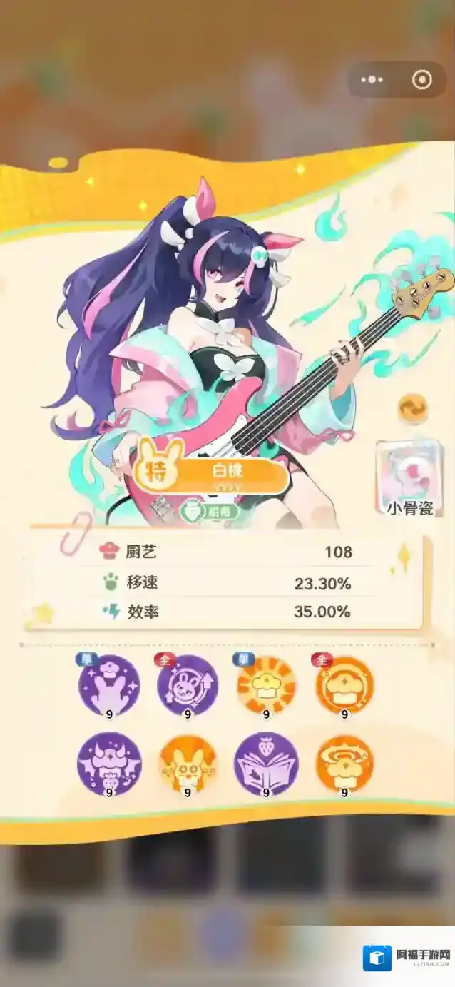 白桃作为店员管理店铺时,她的厨艺可是能够达到108的,可以说是强度算是比较高的等级了。小骨瓷作为他的半生灵,在十二星级的时候就能够解锁携带了小骨瓷能够幻化而成为一把琴,走在哪里都可以和白桃如影随形,像是一对心有灵犀的主仆。白桃本身就是一位非常热爱工作的店员,如果拥有同特质的电源既能使用可以对它的各项属性也产生辅助效果。