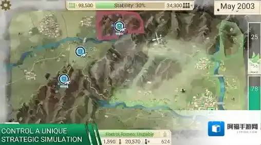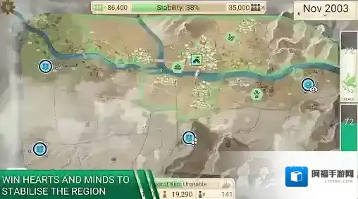4、上方可以额看到稳定度,左侧是支持者,右侧是反对者,稳定度越高,支持者增长就会越快,最右侧是声望值,当声望值归零后就会结束游戏。