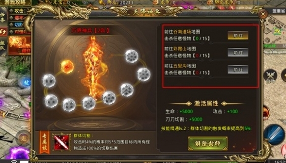4、神兵解锁后还需要升阶,升阶的要求是去不同的地方刷怪,这挺简单的,优先将神兵升满。