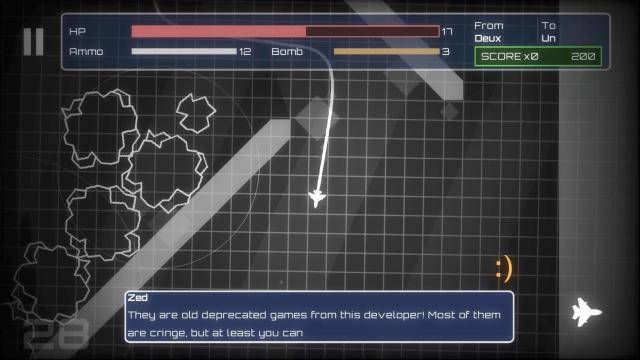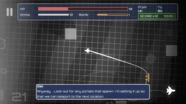 4、正式开始后点击左右屏幕可以控制飞行的方向,同时按住两边的屏幕可以发射子弹摧毁敌人和障碍物。屏幕上方的HP是血量,Ammo是弹药,Bomb是炸弹数量